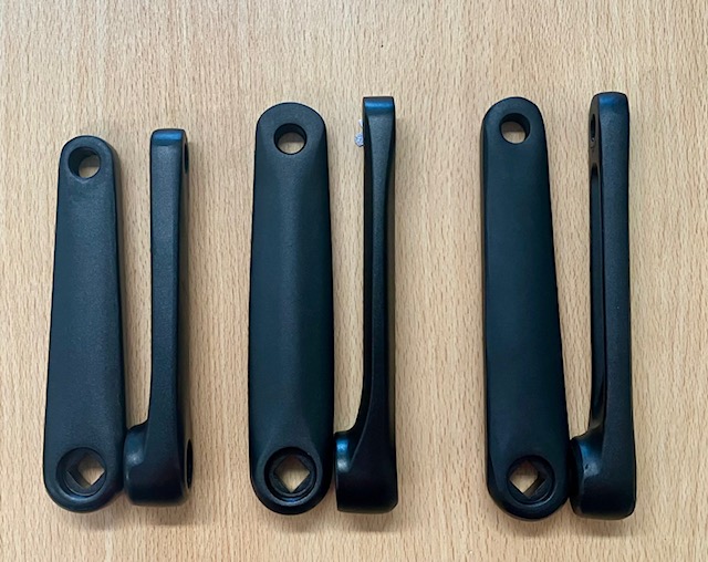 Om de breedte van de pedalen (Q-faktor) smal genoeg te houden heb je rechte cranks nodig in een velomobiel. Nu hebben we daar dus meer keuze in. Per set zijn deze 30,-