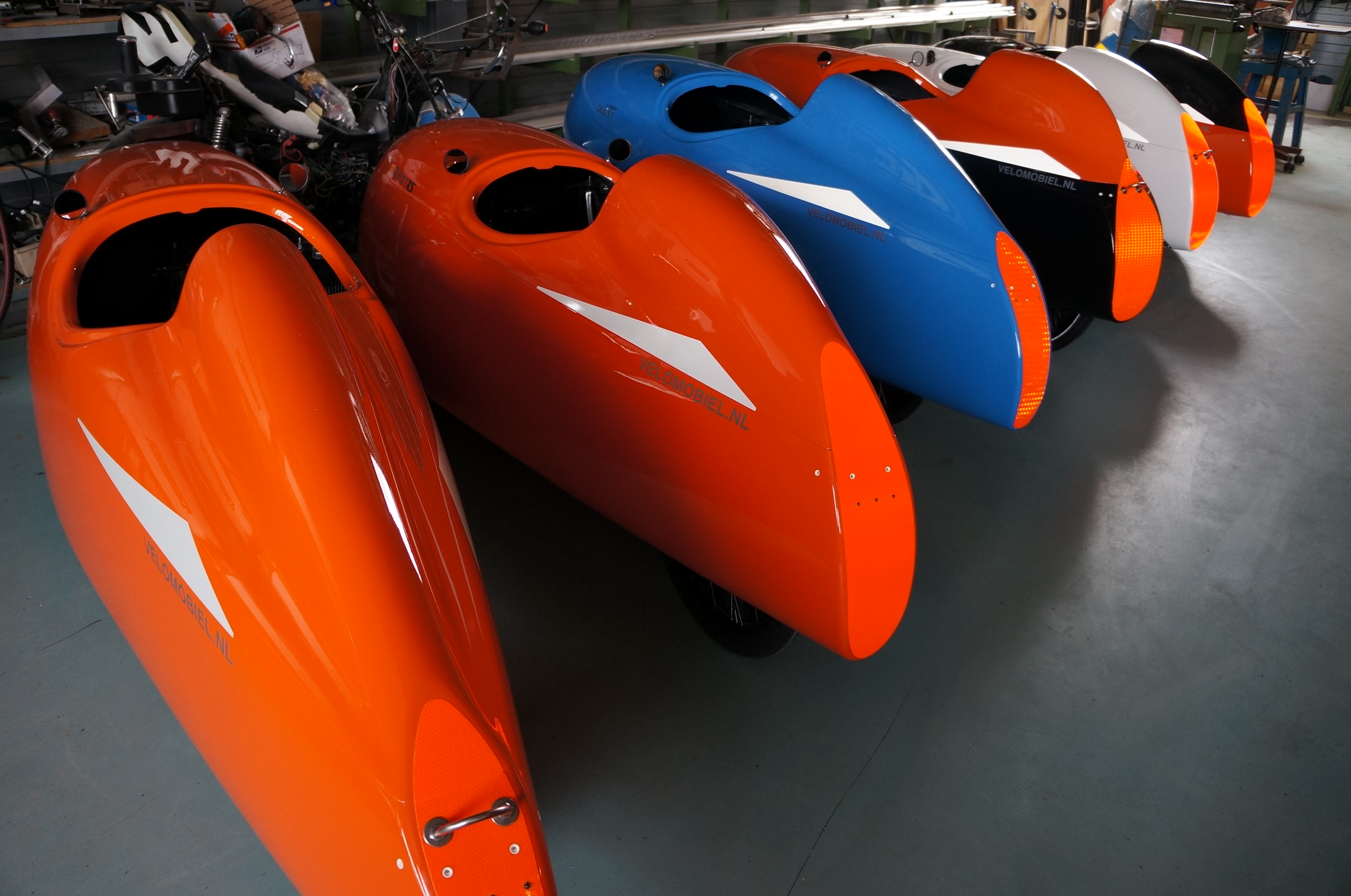 Dit zijn de eerste velomobielen die volledig gespoten zijn met autolak i.p.v. de gelcoat laag die in de mal gespoten werd. Voorheen kwamen ze kant en klaar met gelcoat uit de mal en was het moeilijk kleine foutjes bij te werken. Bovendien is de glans van autolak beter en blijft het langer mooi. Ook zijn er meer kleuren beschikbaar (bijv. metalic) en is een schade beter bij te spuiten. Groeten, Theo